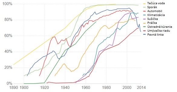 Nasledujúci graf ukazuje aké % z domácností v USA využíva niektoré z dnes už celkom „bežných“ výdobytkov technologického pokroku v čase. V roku 1930 určite nebola napr. taká práčka v domácnosti žiadnou samozrejmosťou. Ale dnes? Vieme si bez tejto vtedajšej novinky vôbec predstaviť každodenný život?