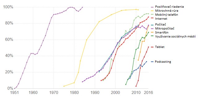 Predchádzajúce dva grafy krásne ukazujú to, že uvedenie nových technológií na trh, je spotrebiteľmi rýchlejšie či pomalšie vždy prijímané. Spotrebitelia sa na ne logicky postupne adaptujú, pokiaľ sú dostatočne dostupné (cenovo) a prakticky využiteľné. A o to rýchlejšie rastie dopyt po nich, čím rýchlejšie môžu bežný život ľudí uľahčiť či ovplyvniť k lepšiemu.