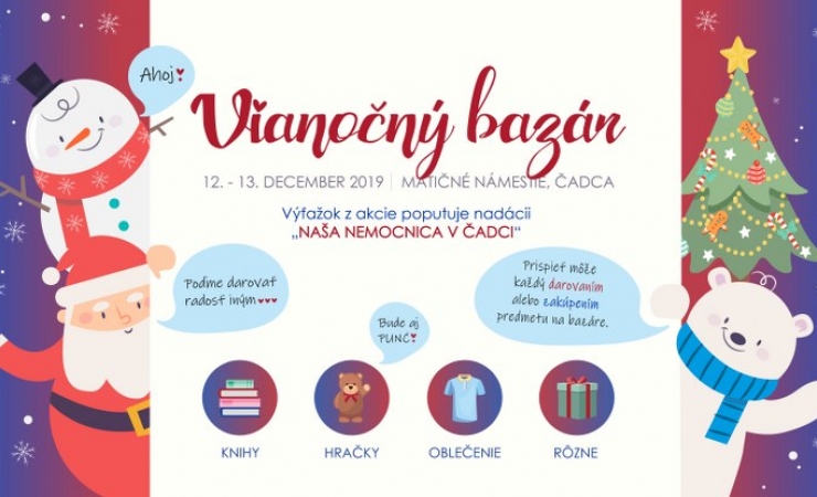 1. ročníka dobrovoľného VIANOČNÉHO CHARITATÍVNEHO BAZÁRU, ktorý prebiehal 12. - 13. decembra 2019 počas vianočných trhov na Matičnom námesti v Čadci.