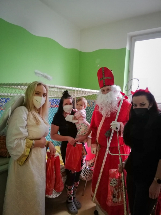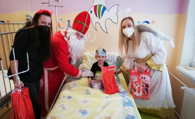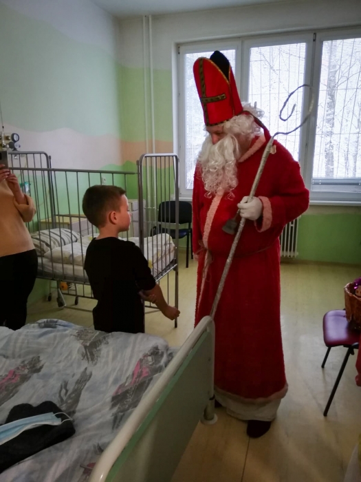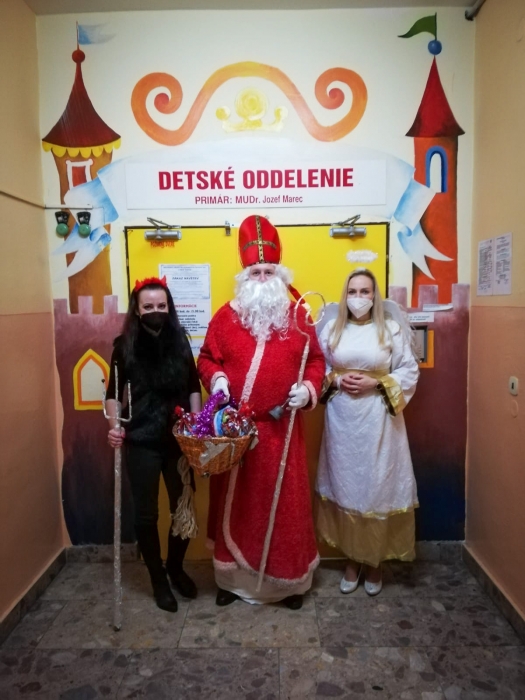 Napriek nepriaznivej situácii spojenej s Covid-19 sa naši kolegovia rozhodli neporušiť tradíciu a na deň sv. Mikuláša opäť navštívili tých najmenších, ktorí žiaľ tento sviatok museli tráviť za nemocničnými stenami, aby im potešili srdiečko a odovzdali sladké darčeky, ovocie či omaľovánky. Od detí, ako sami aktéri povedali - Mikuláš (Lacko Hruška), čert (Janka Padyšáková) a anjel (Ivanka Oboňová), dostali nielen básničky, modlitby a úprimný šibalský úsmev, ale omnoho viac.